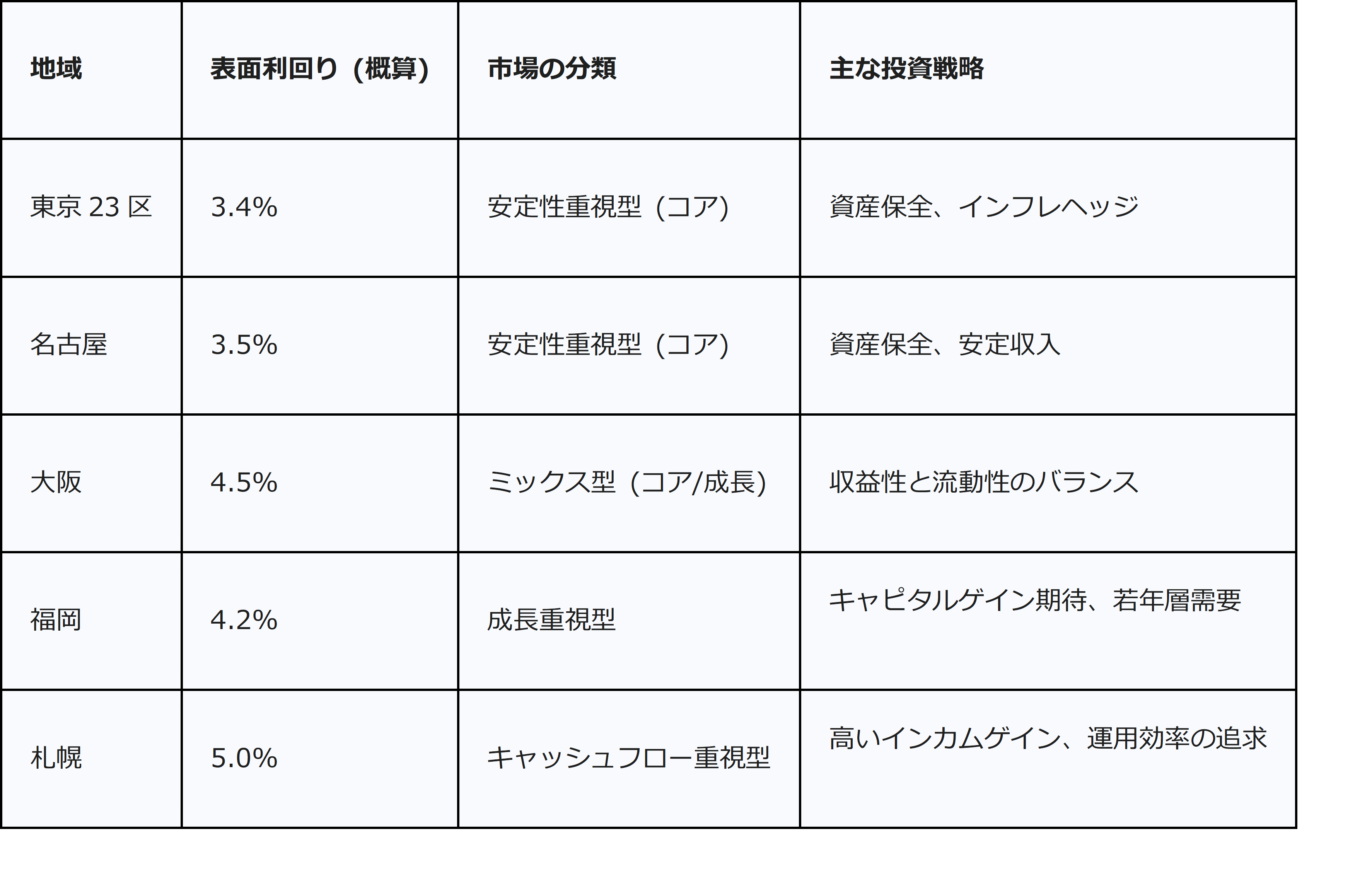 市場は大きく、高い流動性と資産保全を重視する三大都市圏市場と、高いキャッシュフローを追求する地方中核都市市場に分類されます。